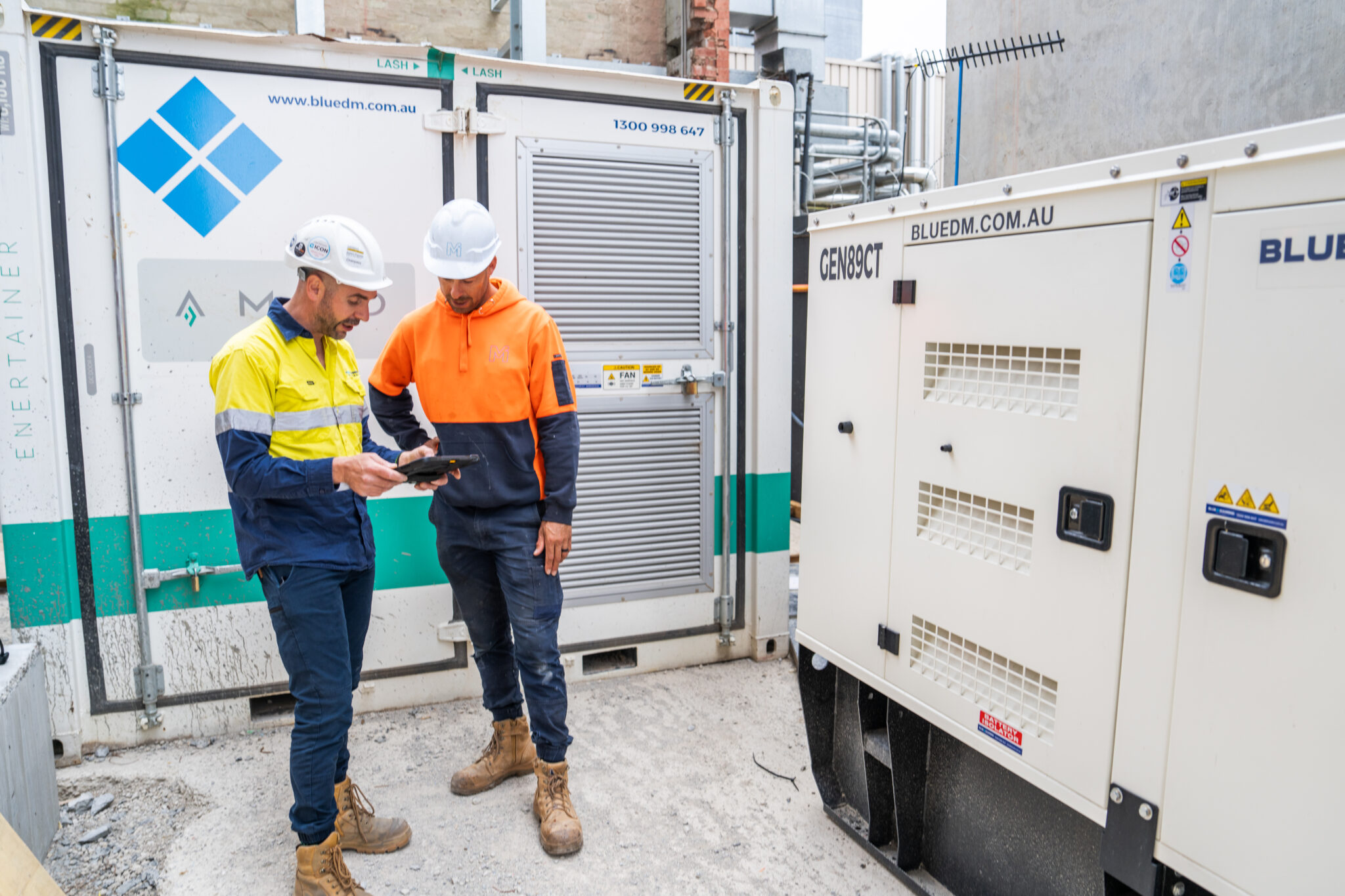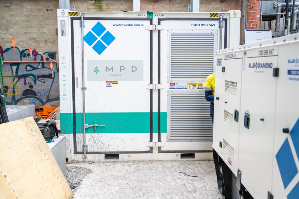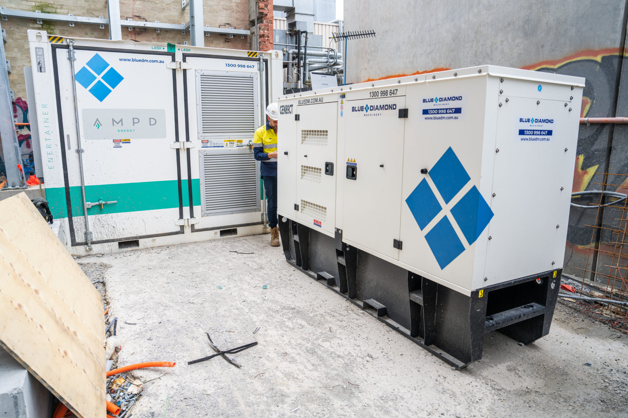 ConstructionM Squared Electrical chose a Battery Energy Storage System (BESS), supplied by Blue Diamond Machinery, as a drop-in solution for all onsite power usage. This included powering 4 construction elevators, 5 concrete pumps, crane signage, hoists and site amenities. Â
